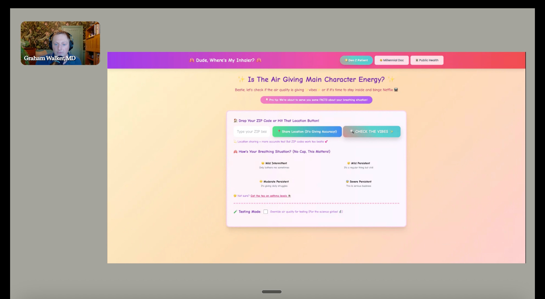 An air quality dashboard, one built for patients, clinicians and public health authorities. The fun twist: make it Gen Z and add main character energy.